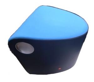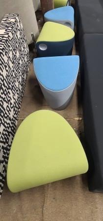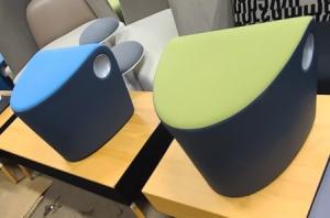 The image shows a Gunlocke Sooch Stool, designed by the Favaretto & Partners design studio. It is characterized by its unique shape, combining a rounded top with a tapered base, and often features two-tone upholstery. The stool is designed to promote active sitting and movement, encouraging users to shift and adjust their position. It is commonly used in office and collaborative spaces.