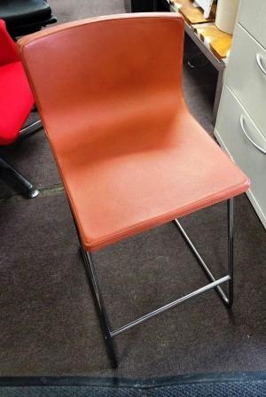 This orange bar stool is the IKEA BERNHARD stool with a backrest. It features a chrome-plated frame and a padded seat upholstered in "Mjuk orange" leather.