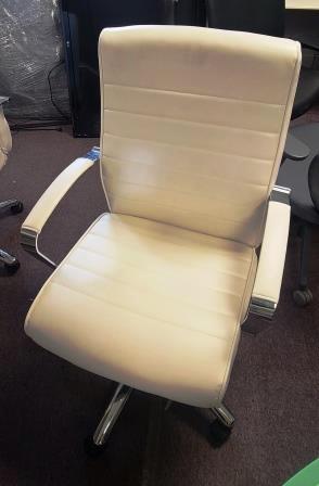 The image shows an OfficeSource Studio Collection Mid Back Chair with a chrome frame in white. This chair features:
