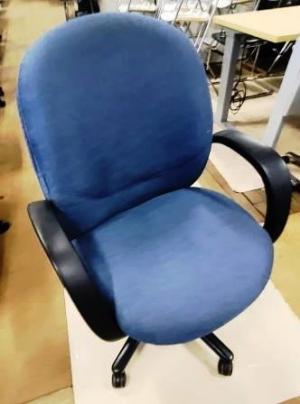 The image shows a blue Vecta office chair. Vecta chairs, manufactured by Steelcase, are designed for training rooms, collaborative areas, or home offices. These chairs are known for their ease of use and storage, featuring a flip-up seat that allows for nesting and compact storage. Office chairs are designed for comfort and support during extended periods of sitting, often incorporating ergonomic features to promote good posture and reduce back pain.